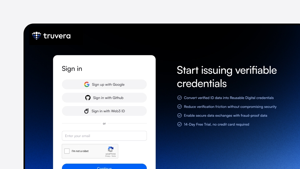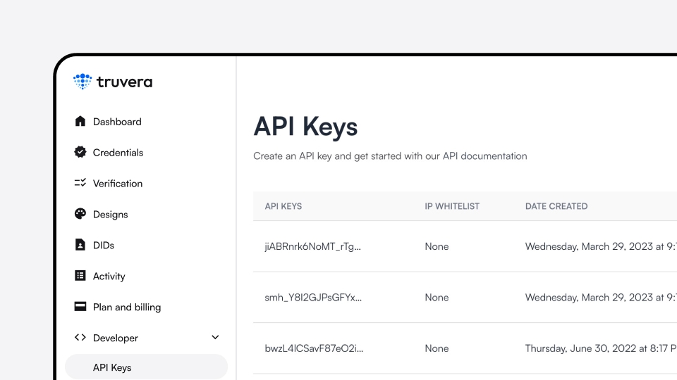 [Truvera API](https://docs.truvera.io/truvera-api) easily integrates with your system and data sources, simplifying the creation, verification and management of Verifiable Credentials. No blockchain or cryptography knowledge is required.
