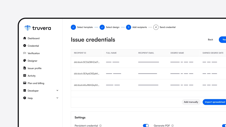 Truvera's user-friendly workspace and API allow you to invite and manage trusted issuers and verifiers. Simplify the process of identifying which issuers and verifiers are trustworthy within a particular ecosystem.