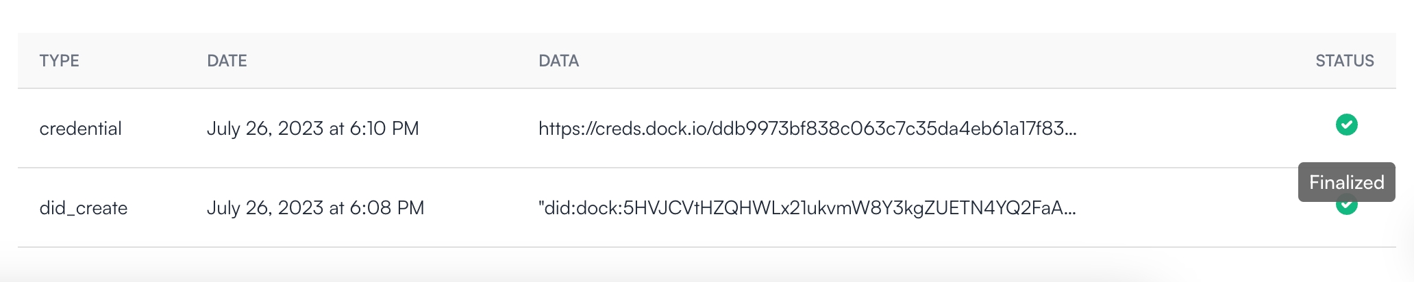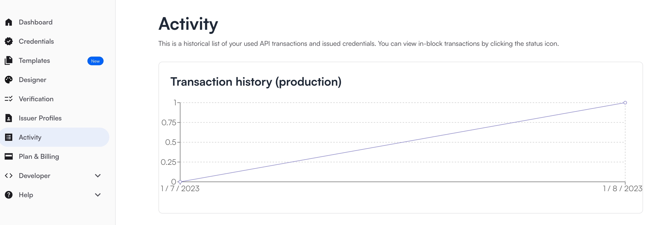 To see a historical list of your used API transactions and issued credentials, click on the Activity menu item. This page shows a historical list of credential issuance events and blockchain transactions, such as DIDs and revocation.