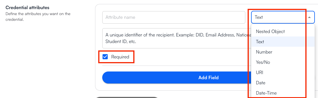 In Credential attributes, add the type of data you want to appear on the schema. You can do this in two ways: