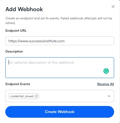 You can add or modify webhook endpoints that will send events when issuing or when transactions occur. Under Developer, select Webhook and click Add Endpoint on the top right.