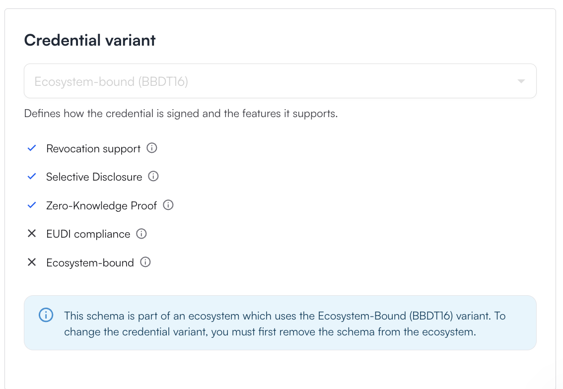 There is a 4th credential variant **Ecosystem-bound (BBDT16)** that is used for [Ecosystem bound credentials.](https://docs.truvera.io/truvera-workspace/monetizing-credentials) It will get automatically selected when a price is assigned to a schema in an ecosystem.