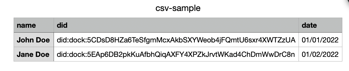 You can download the CSV sample file to use as a base for you recipient data upload. The sample file has only 3 collumns with the *name*, *did* and *date* attributes.