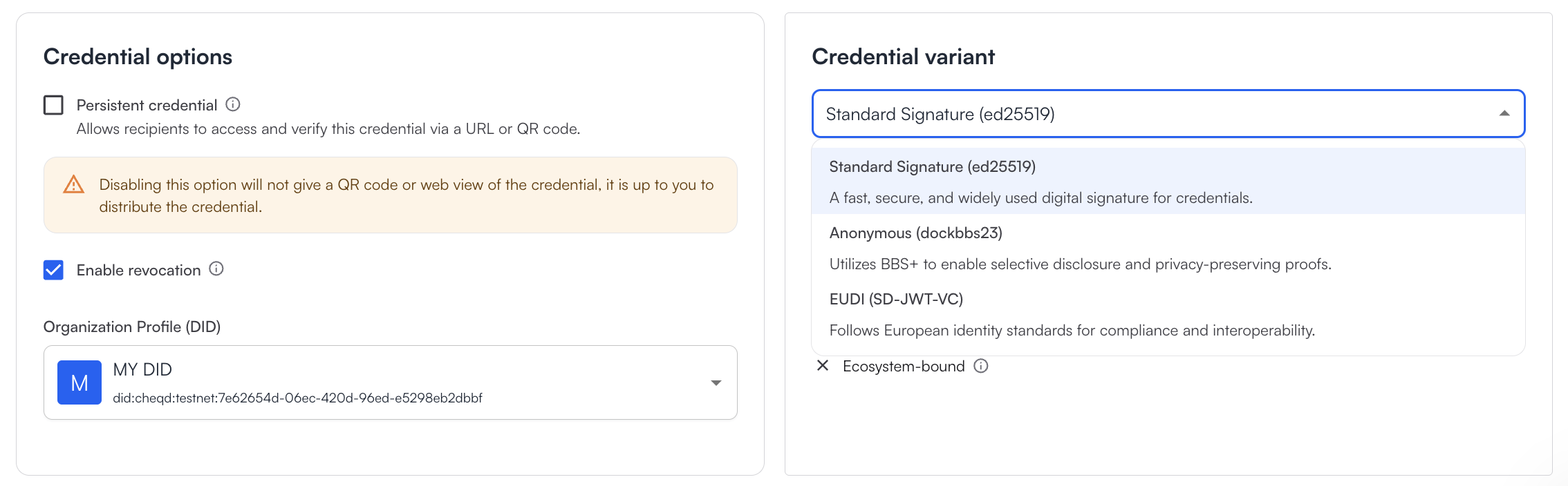 * **Standard Signature (ed25519)** - a more simple credential variant that is the best option for interoperability with other verifiable credential services.