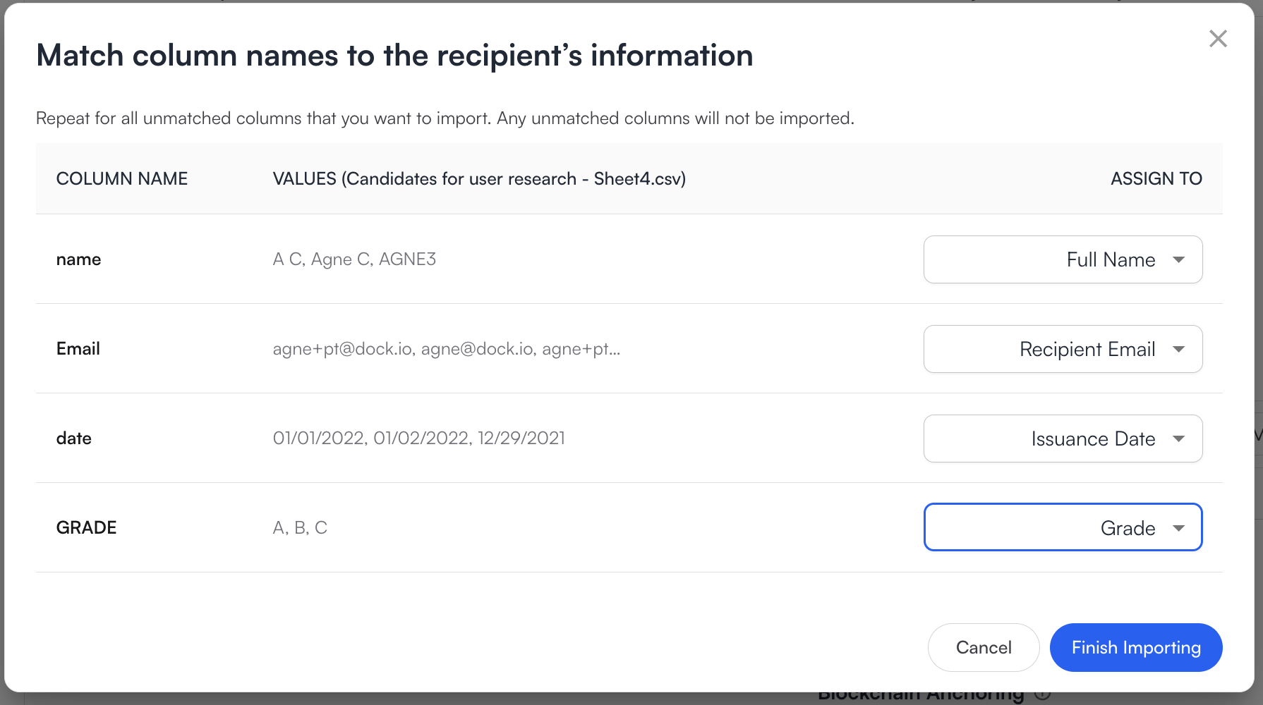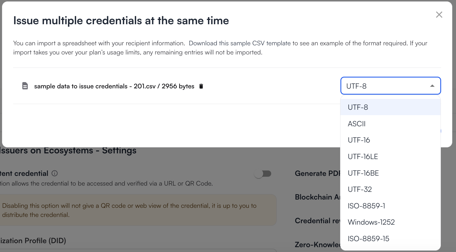 You will be asked to match the columns on the csv file to the credential fields. If there are any required fields on the credential schema they must be filled in, otherwise the import will not be successful.