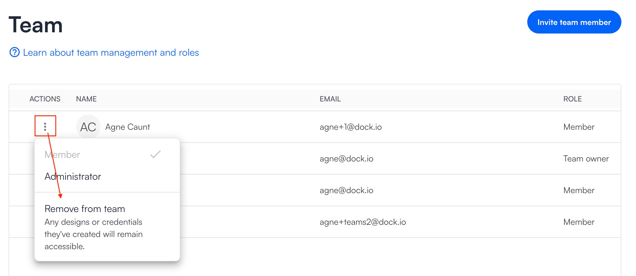 Only a team owner and administrators can remove a team member. A member cannot remove themselves. Learn more about roles.